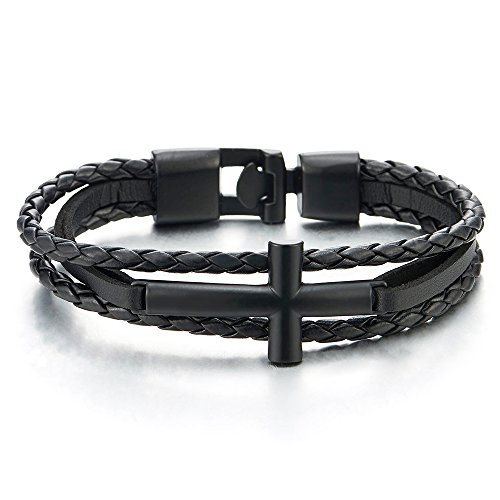 COOLSTEELANDBEYOND Horisontell sida sida tre rader kors armband - flätat läderarmband för män och kvinnor, 21 cm, Svart syntetiskt läder, ej tillämpligt