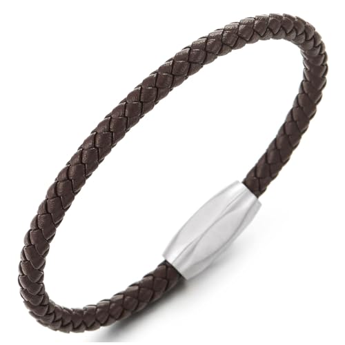 COOLSTEELANDBEYOND Minimalistiska män kvinnor tunt flätat läder armband svettband armband, rostfritt stål oval magnetisk stängning, Länge 21CM, Breite 0.5CM, Brun läder, Ingen ädelsten