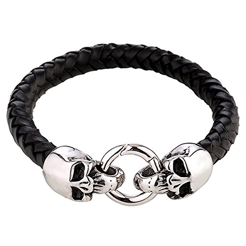 DonDon armband för män flätat läder med rostfritt stål dödskalle huvud lås, 8 5 inch, Läder, Ingen sten