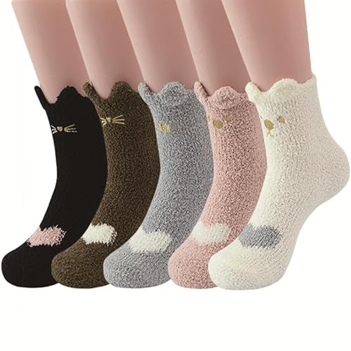 Jupsk Fluffiga strumpor för kvinnor vinter termiska strumpor för säng korall fleece roliga katttassstrumpor för kvinnor och flickor 4–7, 5 par, Material: Polyester, 35/40 EU