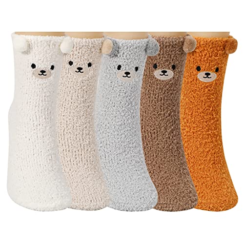 QKURT 5 par fluffiga strumpor, korall fleece vinter mjuka sovstrumpor tecknad björn öron tofflor strumpor termiska sängstrumpor för flickor, kvinnor, Flerfärgad björn, en storlek