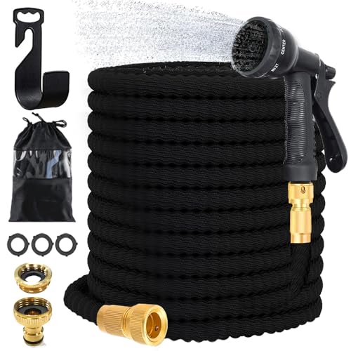 VOUNOT Flexibel trädgårdsslang 30 m, flexibel vattenslang töjbar med 10 sprayfunktioner, snabbadaptrar och väggfäste, svart