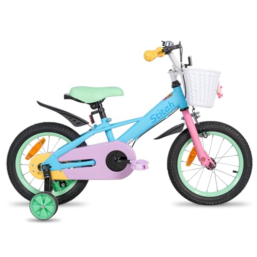 STITCH Macaron 14 tums barncykel för 3–5 åriga flickor och pojkar, flickcykel med korg och stödhjul