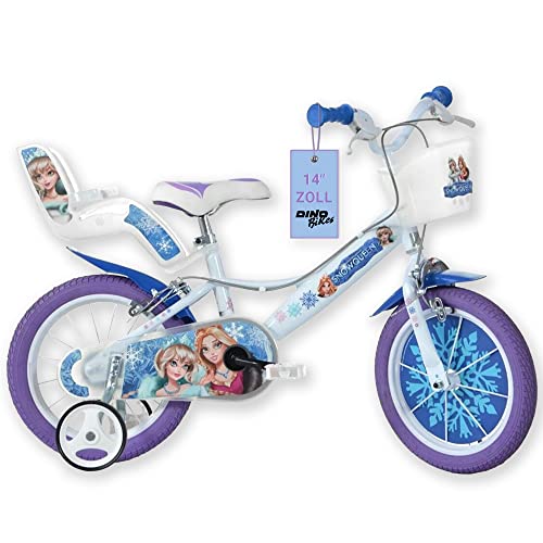 Dino Bikes – 14 tums barncykel Frost – flickcykel med avtagbara stödhjul från 3 år – barncykel med framkorg och dockhållare – justerbar sadel- och styrhöjd (vit, blå)