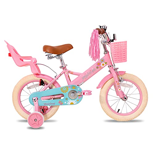 JOYSTAR 14-tums barncykel för flickor på 3–5 år, med stabilisatorer, flickcykel med korg, band och docksäte, rosa
