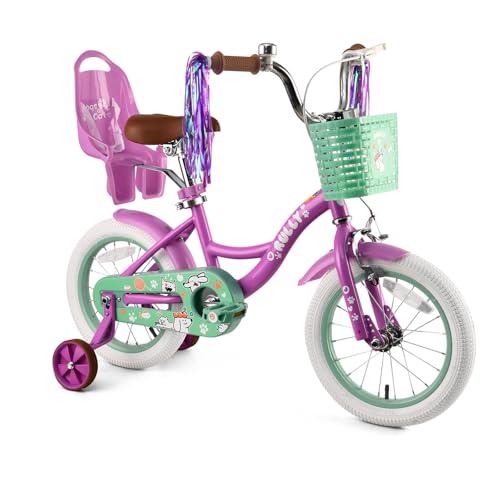 JOYSTAR Stitch Daisy 14 tum barncykel för 3–5 år flickor. 14 tums hjul flickcykel med docksäte och cykelstreamers & stabilisatorer, lila