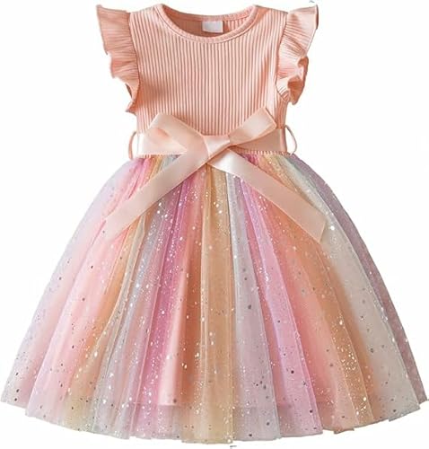 JiAmy Flickklänningar, ribbade, stickade tyllklänningar, paljetter, flygande ärmar, regnbåge, vårig barnklänning för 1–6 år, Rosa, 3-4 År