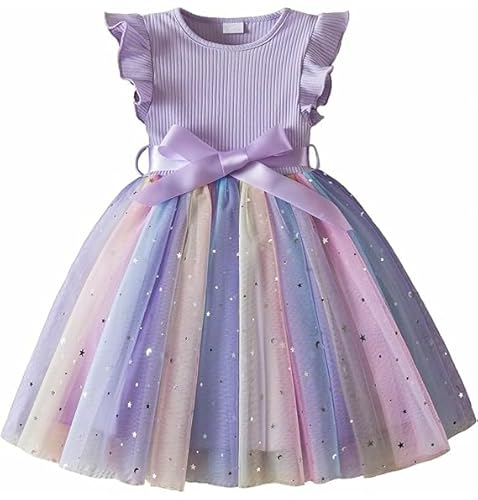JiAmy Flickklänningar ribbade stickade tyllklänningar paljett vår flygande ärmar regnbåge barnklänning för 1-6 år gammal, Lila, 4-5 År