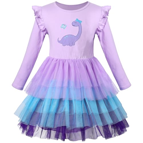 VASCHY Flickklänningar, 3–9 år, långärmad meshprinsessklänning, sött mönster, bomull, vardagsliv, för småbarn, barnkläder, Dinosaurie-cx99, 5-6 År