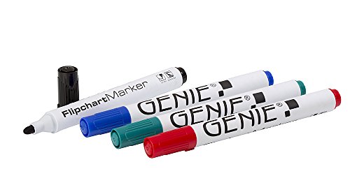 Genie 40042 Flipchart markör i blandade färger – perfekt för blädderblock och skrivtavlor, linjebredd 1-3 mm, paket med 4 inkluderar 1 x svart, blå, röd, grön