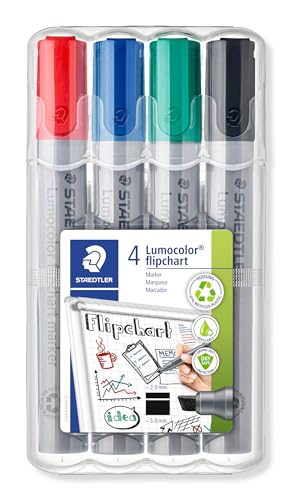 Staedtler Lumocolor 356 WP4 Flipchart-Marker, farbintensiv, geruchsarm, Rundspitze ca. 2 mm Linienbreite, hohe Qualität, ideal für Flipchart-Blöcke, Set mit 4 Farben, 1 Box, 356 WP4 ST