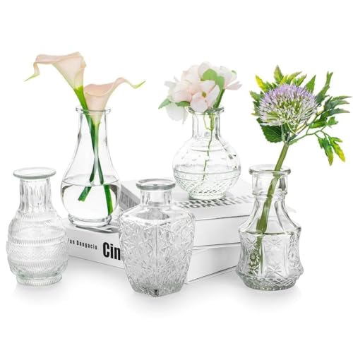 Glasseam Glass Small Bud Vase: Vintage Flower Vases for Centerpieces Mini Crystal Clear Vase Set of 5 Cute Decorative Vases for Flowers Decor Wedding Table Dining Room Decorations