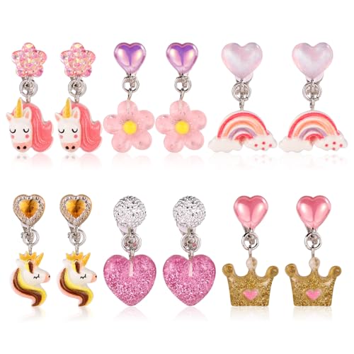 6 Par Clip On Drop-Örhängen, Färgglada Icke-Håltagna Clip On-Örhängen Harts Unicorn Rainbow Crown Flower Heart Clip On-Örhängen för Dress Up Princess Smycken Tillbehör
