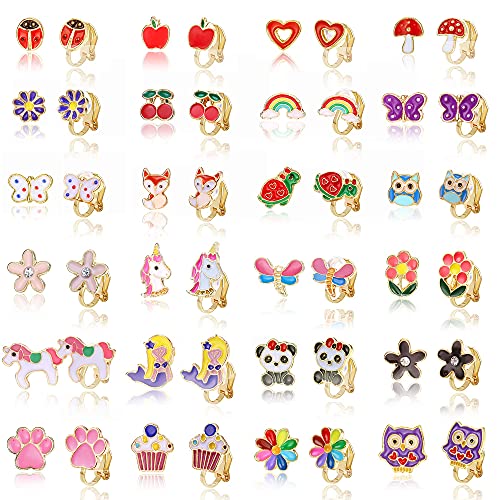 CASSIECA 24 par clip-on-örhängen för icke-piercade öron, söta blandade djur, enhörning, blomma, örhängesset för kvinnor, flickor, blandade färger, smärtfri icke-piercing, örhängespaket, Gummi