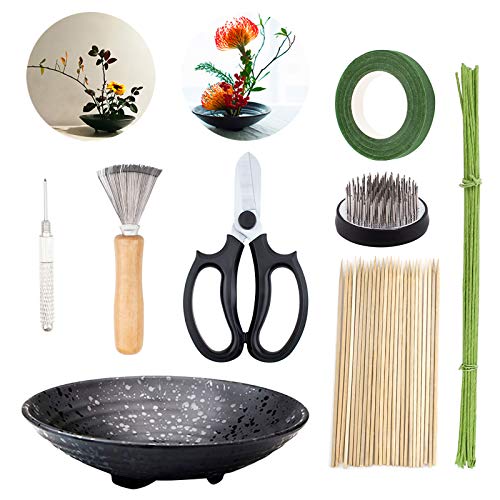 WANDIC Flower Arrangement Kit, Set med 51, Runda blomsterhållare, Keramisk blomkruka, Kenzan Needle Cleaning Pin & Rake, Floral Stems and Floral Tape for Flower Arrangement Art