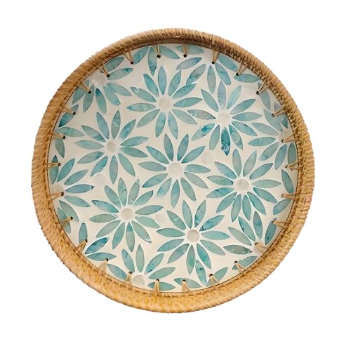 Rund bricka, vävd serveringsbricka, serveringsbricka i modern och boho-dekor, handvävda dekorativa tallrikar för soffbord (Grön blomma)