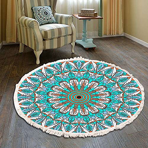 Vintage boho bomullsmatta mandalamönster tvättbar handvävd böhmisk rund matta med tofsar för sovrum hall vardagsrum soffbord dörrmattor, maskintvättssäker, 100 cm blommor #34
