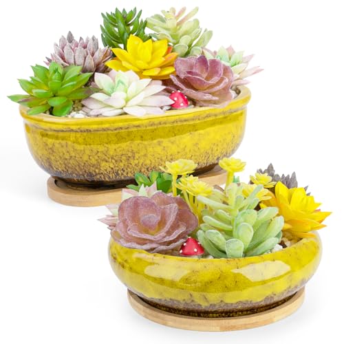 ARTKETTY Suckulenta krukor, keramiska suckulenter, krukor med dräneringsbambubricka, 1 rektangel blomkruka + 1 rund blomkruka för inomhus kaktus bonsai växter hem (gul)