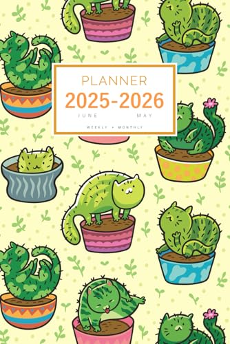 Planner June 2025-2026 May: 6x9 Weekly and Monthly Organizer | Cute Flowerpot Cat Cactus Design Yellow