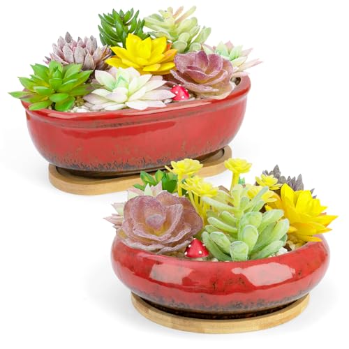 ARTKETTY Suckulenta krukor, keramiska suckulenter, krukor med dräneringsbambubricka, 1 rektangel blomkruka + 1 rund blomkruka för inomhus kaktus bonsai växter hem (röd)
