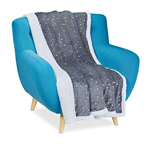 Relaxdays kramfilt med gyllene stjärnor, fluffig filt, lammpäls utseende, dubbelsidig, 150 x 200 cm, grå/vit, polyester, grå
