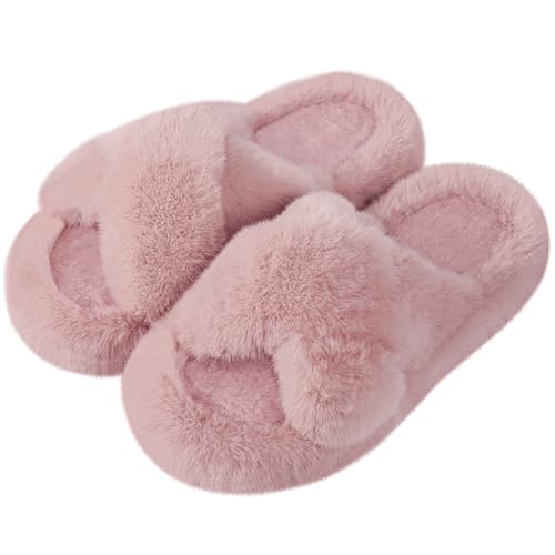 Tofflor för kvinnor, fluffiga tofflor, halkfria varma lurviga mysiga tofflor med öppen tå för flickor inomhus utomhusskor, Rosa, 40/41 EU