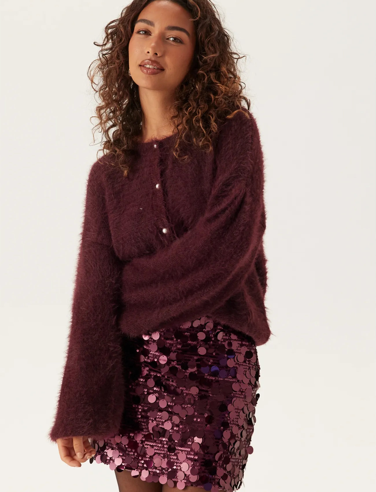 Bubbleroom Fluffy Knitted Pearl Cardigan - Burgundy - M