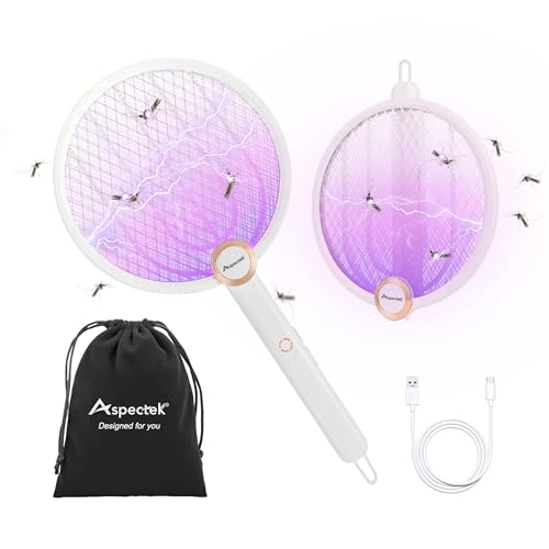Aspectek 3 000 V elektrisk flugsmälla för inomhus- och utomhusbruk, bärbar, uppladdningsbar insektsdödarracket med förbättrad batteritid, USB-laddningskabel, väggfäste