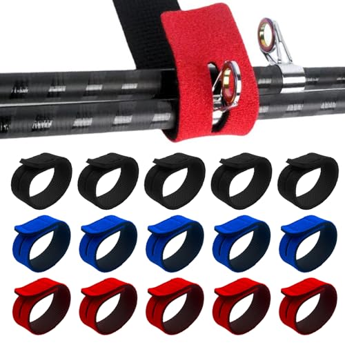 KATIMI 15 stycken kardborreband spöband, 3 färger elastiskt fiskespö bälte, 21,3 x 2,5 x 0,3 cm justerbara fiskespön remmar, förtjockat fiskespöband för spinnspön flugspön