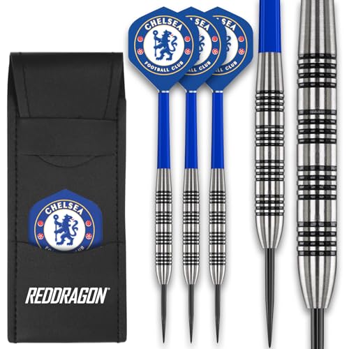 FOCO officiellt licensierade Chelsea FC-flygningar med 80 % volfram 24 g Red Dragon Dart-set – inklusive dartskaft och dartbarplånbok – professionella darttillbehör
