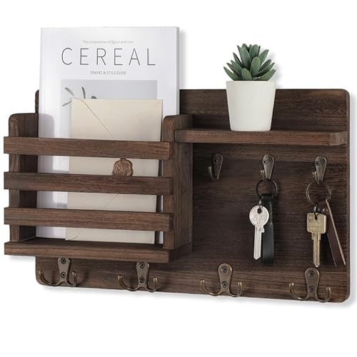Nekon Brevhållare för väggpostorganiserare med nyckelkrokar hall bondgård dekor brevsorterare tillverkad av naturlig tall med flytande hylla och infälld montering hårdvara (40 x 25 x 8 cm) (brun)