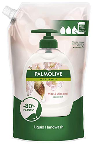 Palmolive Handtvål Milk & Almond Flytande Tvål, Dermatologiskt Testad Handtvätt, Skonsam, Stor Refillpåse Använder 80% Mindre Plast – Refillpåse 1 Liter