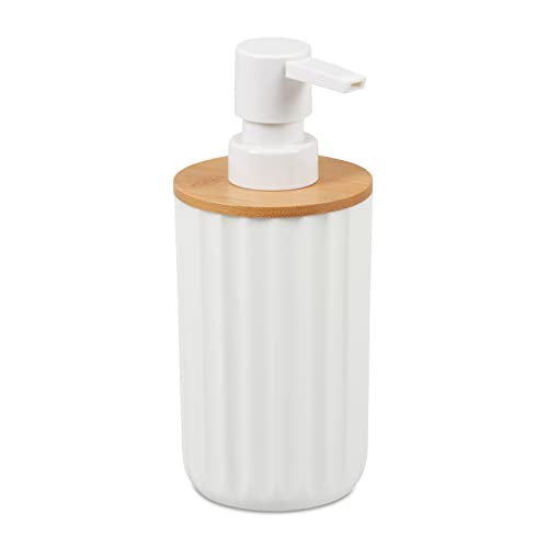 Relaxdays Tvåldispenser, rund, modern, påfyllningsbar, pumphuvud, bambu och plast, flytande tvåldispenser för badrum, vit/natur, 17 x 7,5 x 7,5 cm
