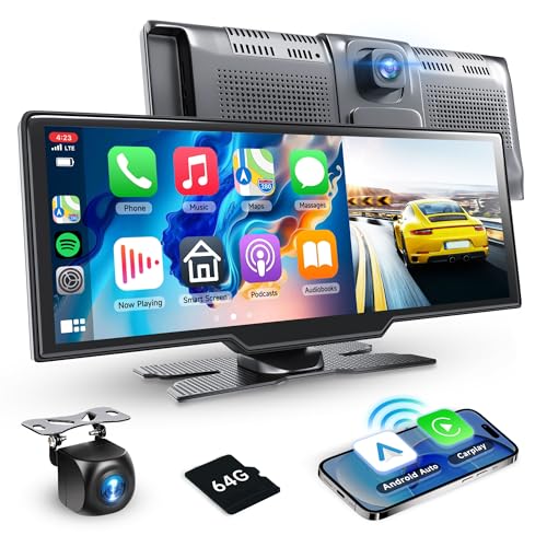Podofo 10,26 tum bärbar bilradio trådlös carplay android bil, 3-vägs kamera, HD-pekskärm med navigering/Bluetooth, Carplay Screeen med front/AHD backkamera, FM-sändare/DVR USB/AUX/64G SD-kort