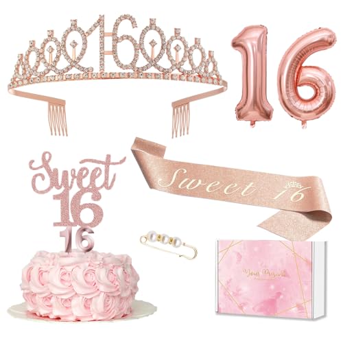 Dekoration 16-årsdag flicka, 16. Födelsedagskrona och skärp, tårtdekoration födelsedag och ljus, roséguld folieballong 16, 16. Present till flickor på födelsedagsfest dekorationstillbehör