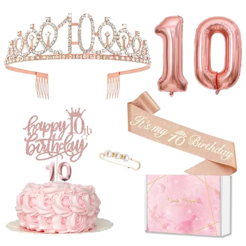 10-årsdag flickdekoration, 10-årsdag Födelsedagskrona och skärp, tårtdekoration födelsedag och ljus, roséguld folieballong 10, 10. Present till flickor på födelsedagsfest dekorationstillbehör