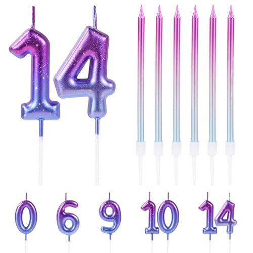 URAQT Födelsedagsljus 3D-form, födelsedagstårtljus, nummer 14 födelsedag ljus lila gradient dekoration lämplig för födelsedag årsdag bröllopsfest examen fest