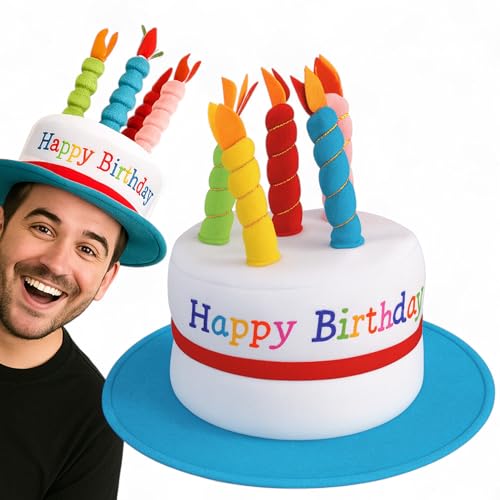 MIJOMA Färgglad plysch-födelsedagshatt med Happy Birthday-broderi och inbjudande mjuka plyschljus, stabil hattbrätta, 30 x 27 cm – festtillbehör för alla åldrar