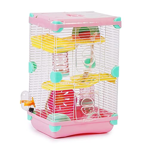 Roborowski hamsterbur, med 2 våningar, hjul, dricktråg och fodertråg, 27,7 x 20,5 x 42,5 cm (rosa)