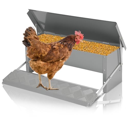 Randaco Utfodrare för hönsmatare av galvaniserat stål 5 kg foderdispenser fodertråg med automatisk pedal och vattentät filt, kycklingfoder för fjäderfä, vattentät och råttsäker
