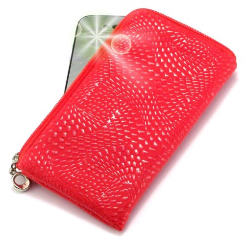 "Coyote" Lyxig vadderad röd läderplånbok med dragkedja/hållare med "Party" svart glitter handledsrem för KP502 kaka. Unik ficka med dragkedja/fodral/skinn/hölster med snodd för mobiltelefon.