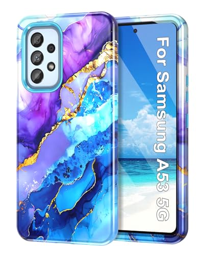 Btscase för Samsung Galaxy A53 5G fodral, marmormönster 3 i 1 slitstark stötsäker helkropp robust hård PC + mjuk silikon droppe skyddande kvinnor flicka fodral för Samsung Galaxy A53 5G, blå lila
