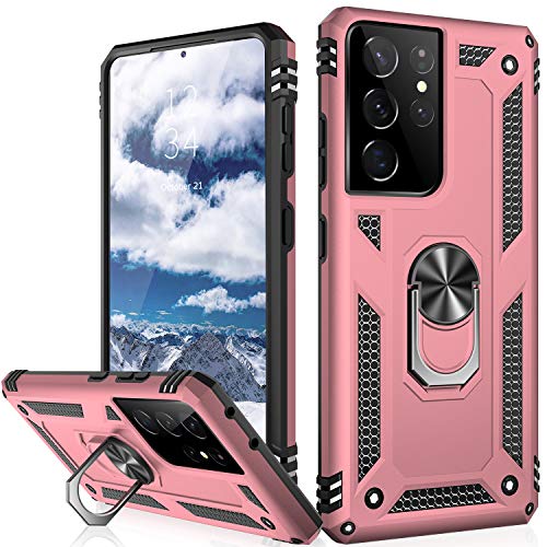 IKAZZ Galaxy S21 Ultra fodral, Samsung S21 Ultra Cover militärkvalitet stötsäkert slitstarkt skyddande telefonfodral pass 4,9 m dropptest med magnetiskt ställ för Samsung Galaxy S21 Ultra Roséguld