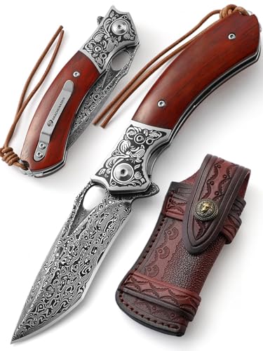 DRACHENADER Knife Damascus Pocket Knife Damascus Steel with Beautiful Leather Sheath, Outdoor Folding Knife Vg10 Core Wooden Handle Gift for Knife Lovers and Outdoor Enthusiasts