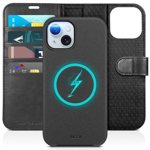 TUCCH Case for iPhone 15, 2 in 1 Removable Folio PU Leather RFID Block, Wireless Charging Folding Stand Magnetic Closure Protective Case for iPhone 15 5G (6.1" 2023), Black