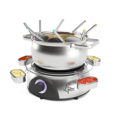SUNTEC Fondue elektrisk för upp till 8 personer – Set med gafflar + stänkskydd + sås hållare – Som alternativ till raclette – Gryta för ost + choklad + fett – Rostfritt stål Fondueset FON-8014 V2A