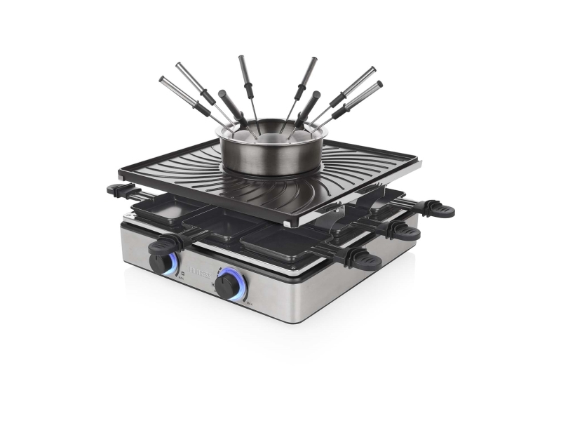 Petra PT4513VDE 2-i-1 raclette- och fondue elektrisk grillplatta 1,3 l 1 400 W justerbar temperaturkontroll, 6 gafflar, 8 non-stick grillar och 8 träspatlar