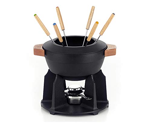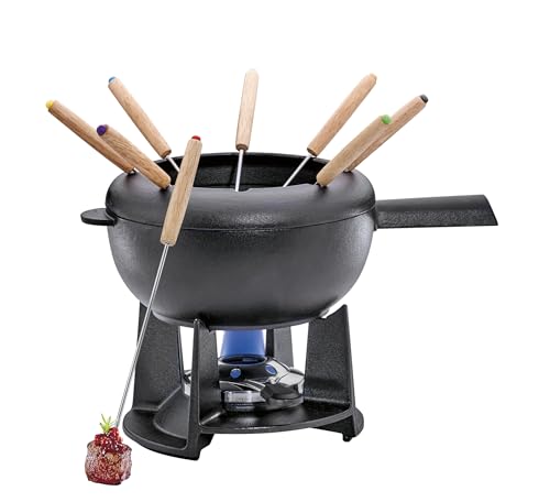 Spring Gjutjärn fondue-set svart | Ø 20 cm | med 8 fonduegafflar och stänkskydd | för ostfondue, köttfondue | Rechaud-brännare
