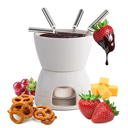Joeji's Kitchen keramisk chokladfondueuppsättning komplett ostfondueset med fonduegryta ljus och gafflar, icke-elektrisk fondueset, uppvärmd med en värmeljus diskmaskinsäker fonduemugg