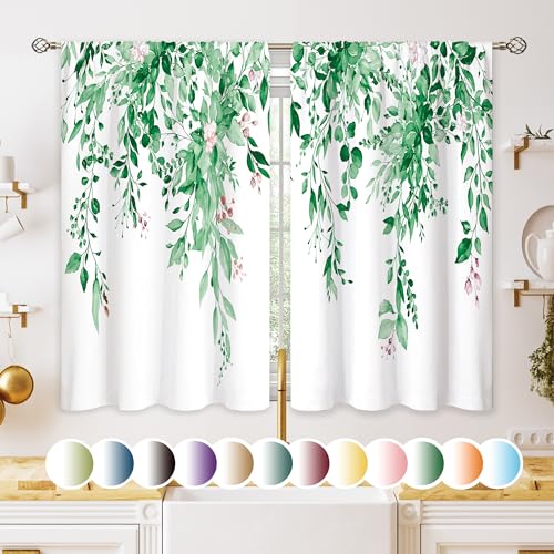 XTMYI Korta badrumsgardiner för litet fönster, 80% mörkläggning akvarell eukalyptus vilda blommor boho-gardiner för kök, barnkammare, 117 cm längd, salviagrön och grå